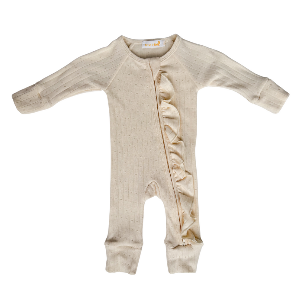 Introducing our Essential Frill Zip Romper in Buttercream Pointelle – a sweet and practical addition to your baby’s wardrobe. Made from our brand-new pointelle fabric, this romper is buttery soft, delicate, and perfect for hospital outfits or everyday wear.