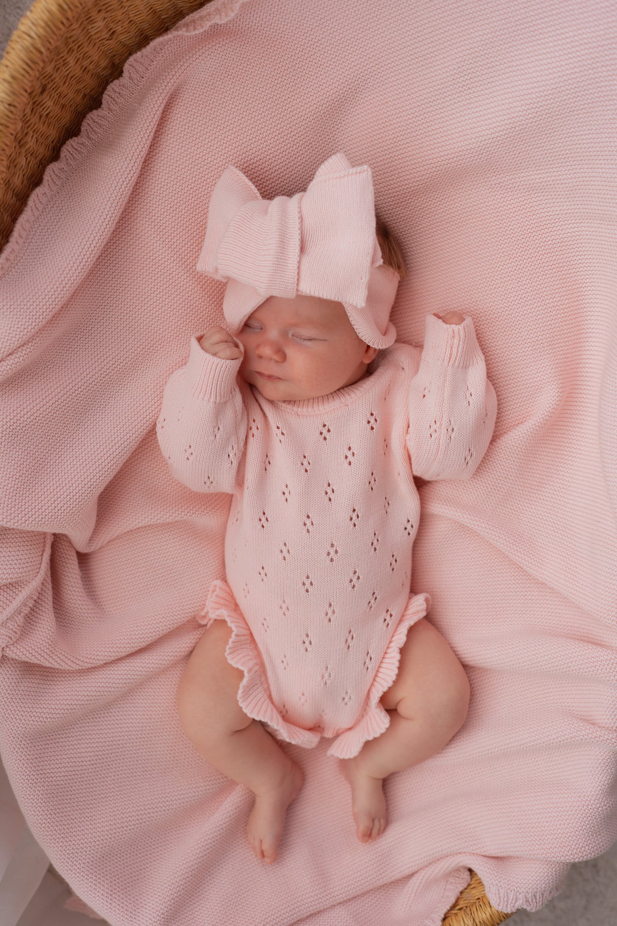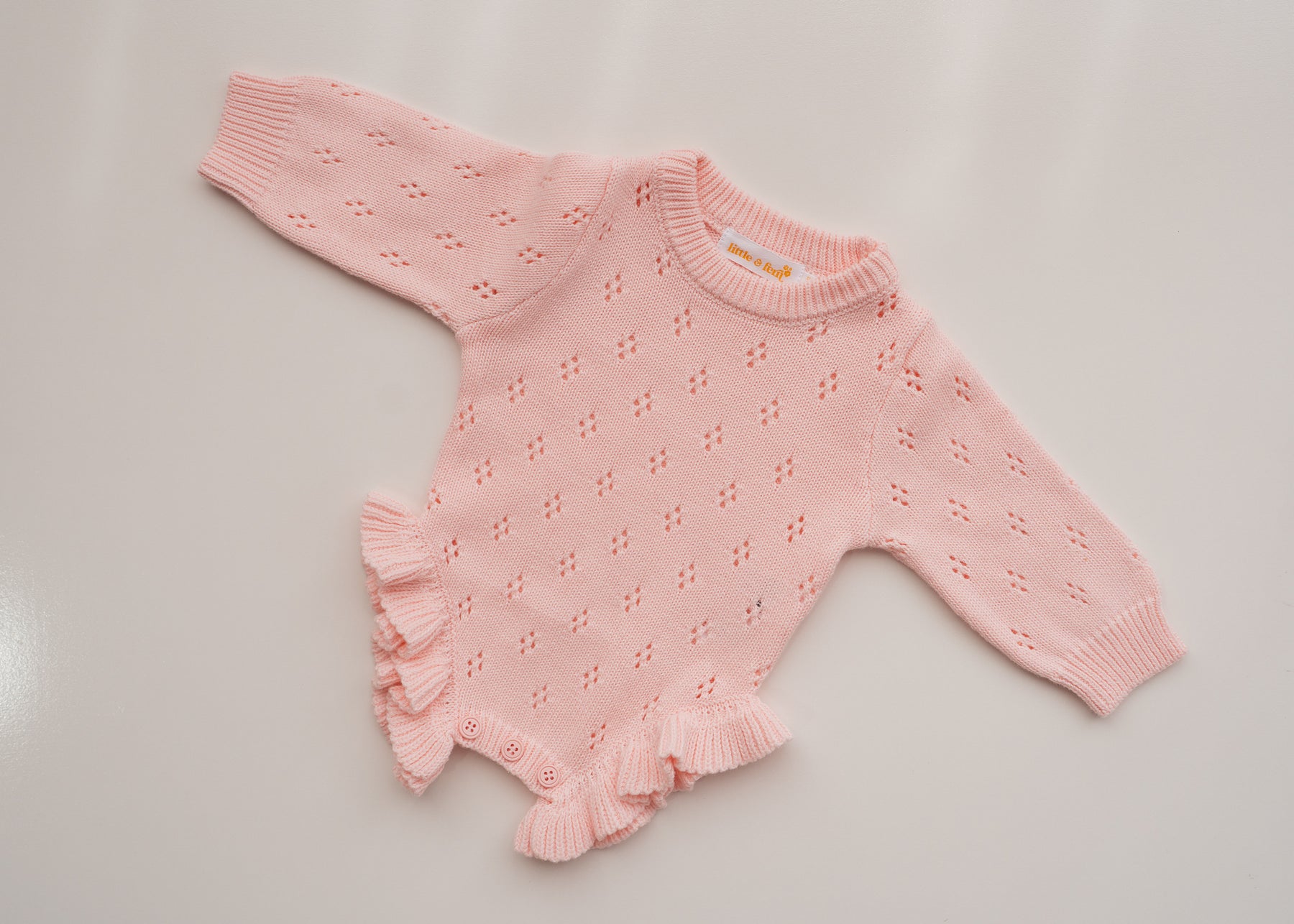 Say hello to the sweetest keepsake for your little love - our beautifully crafted Frill Knit Pointelle Romper in soft Baby Pink.