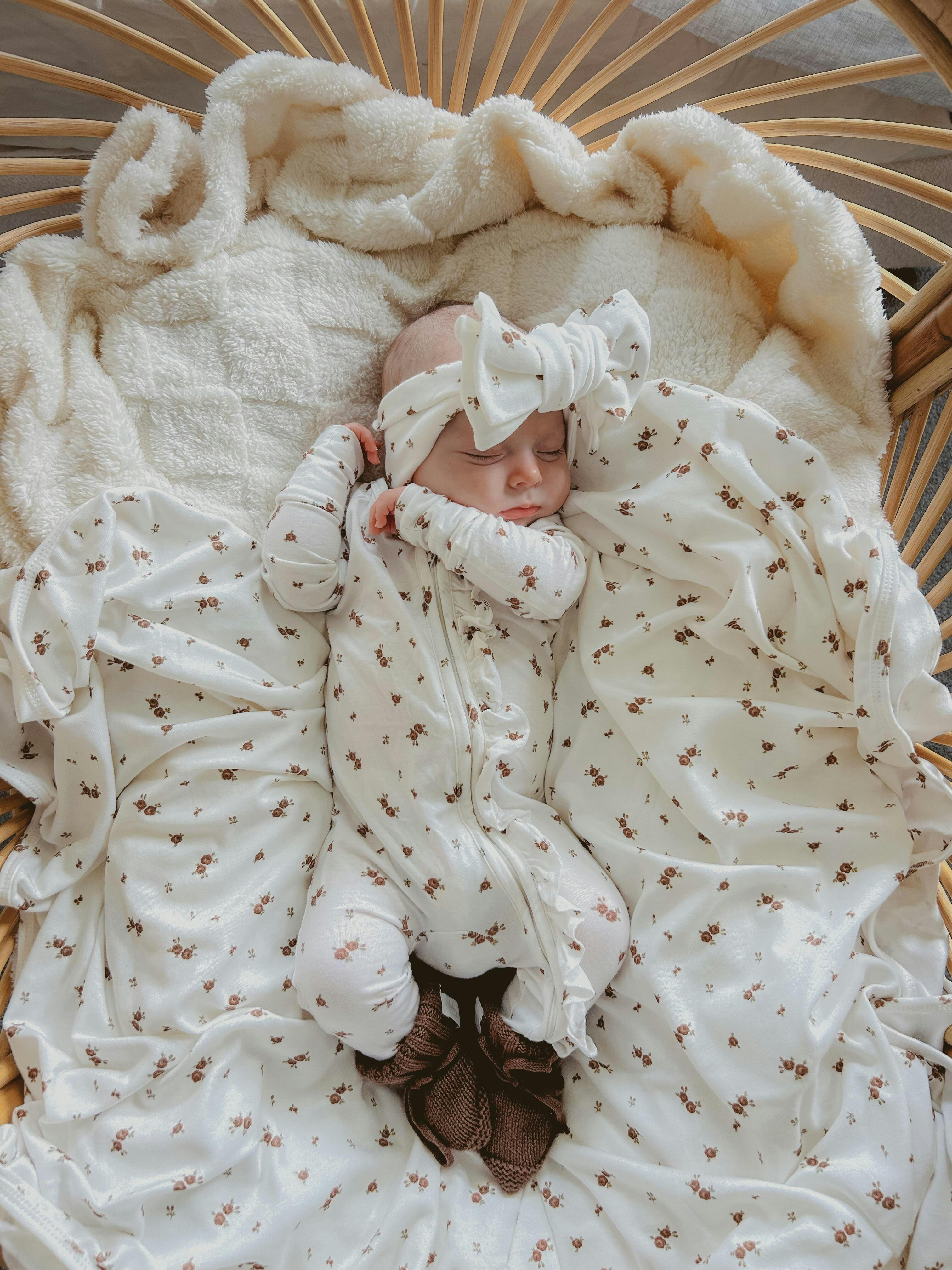 Size: True to size. If your baby is on the cusp of sizes or you want more wear, size up and fold over the wrist and ankle cuffs for longevity.