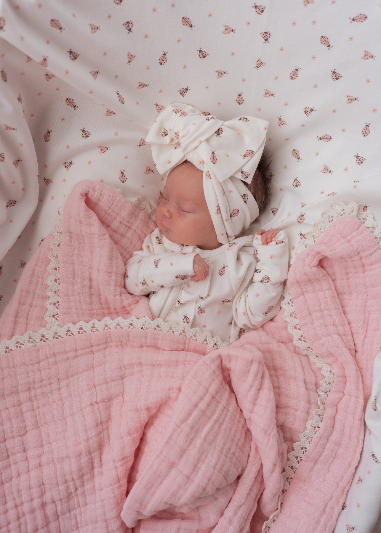 Our Baby Pink Gauze Lace Blanket is a generous 105cm x 105cm to ensure it is able to be used across all ages and aspects of everyday motherhood.