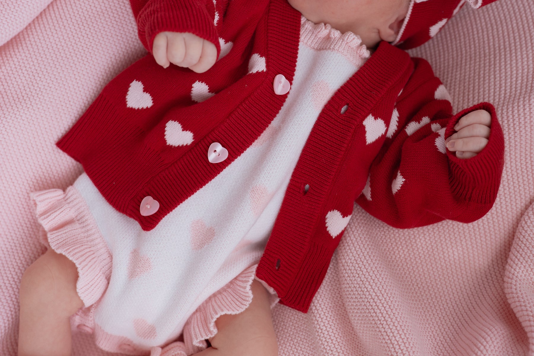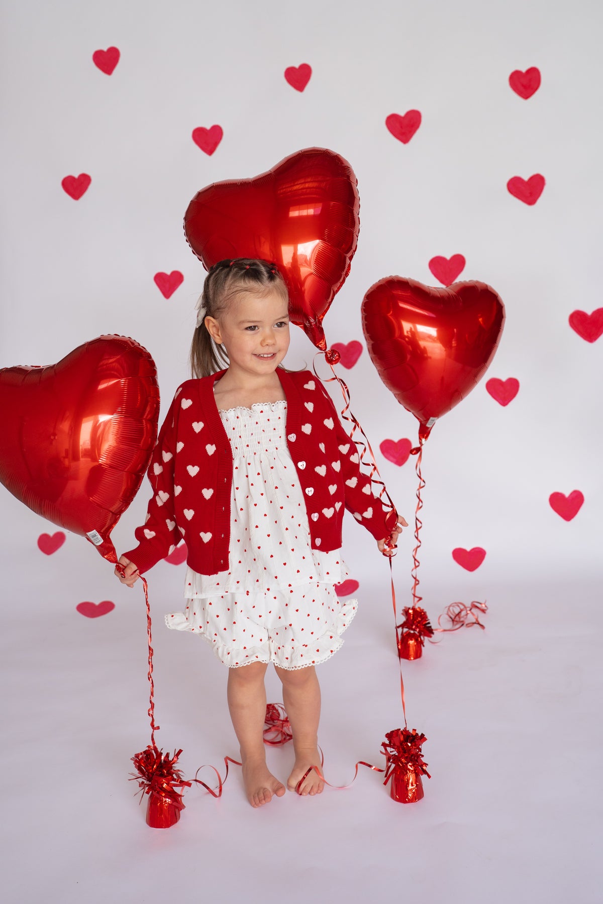 The red hearts print, fitted cuffs, and functional heart buttons add a sweet finishing touch, while the relaxed fit makes it easy to wear and move in.
