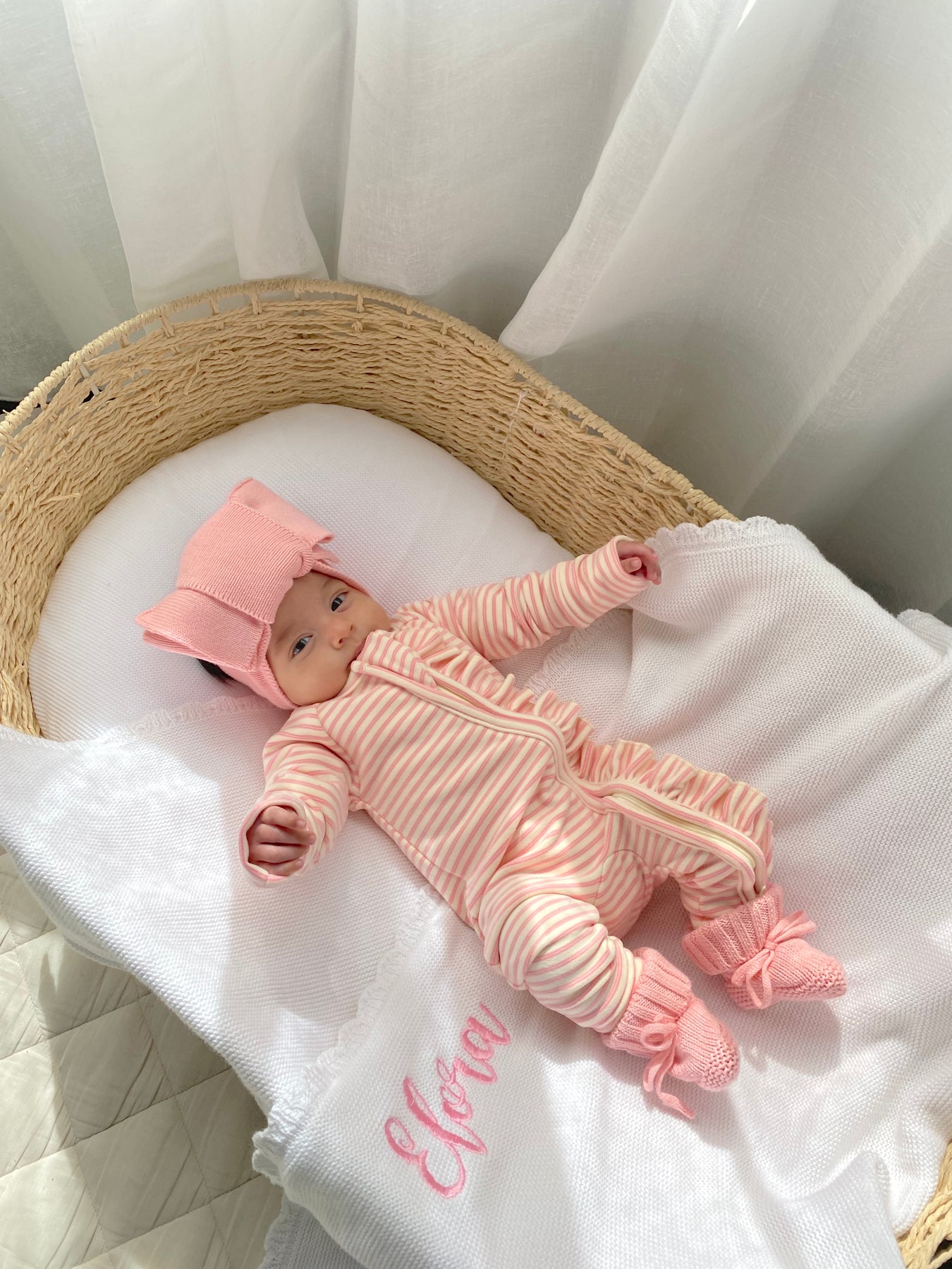 Keep your little one warm and comfortable in our brand new Fleece Frill Zip Romper in Pink Stripes. Thoughtfully designed for cooler days, it combines softness, warmth, and practical features in a timeless, playful style.